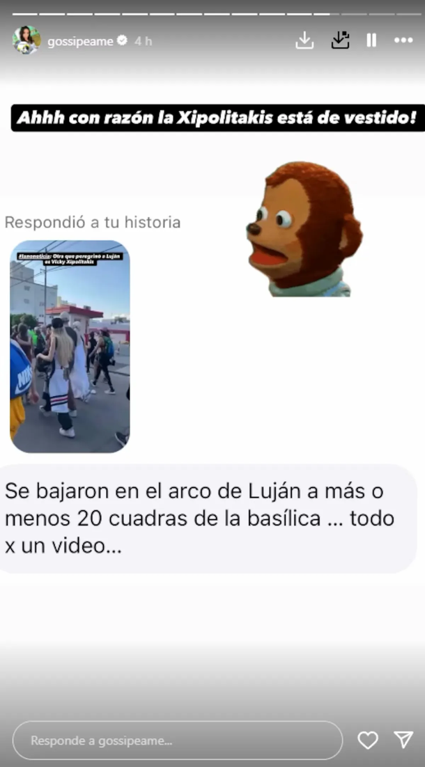 La cuenta Gossipeame, administrada por Pochi, compartió una foto en la que Xipolitakis aparece caminando junto a un grupo de amigas a pocos metros de la Basílica. Fue entonces cuando un seguidor escribió: “Se bajaron en el arco de Luján, a unas 20 cuadras de la Basílica… todo por un video”. El comentario fue replicado por Pochi, quien acompañó el mensaje con ironía: “Ahhh, con razón la Xipolitakis está de vestido”.