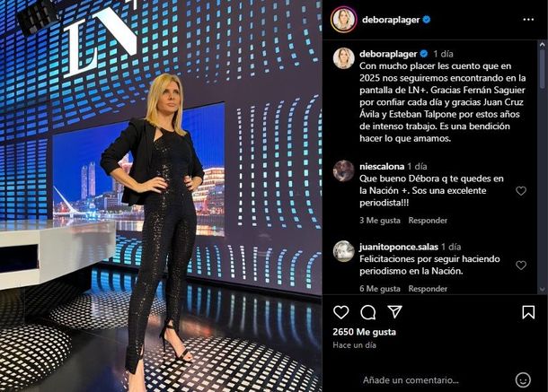 A través de su cuenta de Instagram, Plager compartió una foto desde LN+ y contó si se despide o no del canal. En un escueto comunicado reveló: "Con mucho placer les cuento que en 2025 nos seguiremos encontrando en la pantalla de LN+", rompiendo así todo tipo rumores. Luego de esto, agradeció a las autoridades de la empresa por seguir confiando en ella.