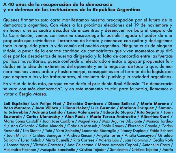 "En virtud de todo esto, porque como decía el presidente Raúl Alfonsín: 'La democracia se cura con más democracia', y en este momento crucial para la patria, llamamos a votar a Sergio Massa", concluye el texto al que se suman las rúbricas de Carlos Ulanovsky, María Sonia Cristoff, Juan José Cambre, Max Aguirre, Mónica Tarducci, Ana Gallardo, Gabriela Massuh, Pablo Ramos y Florencia Canale.