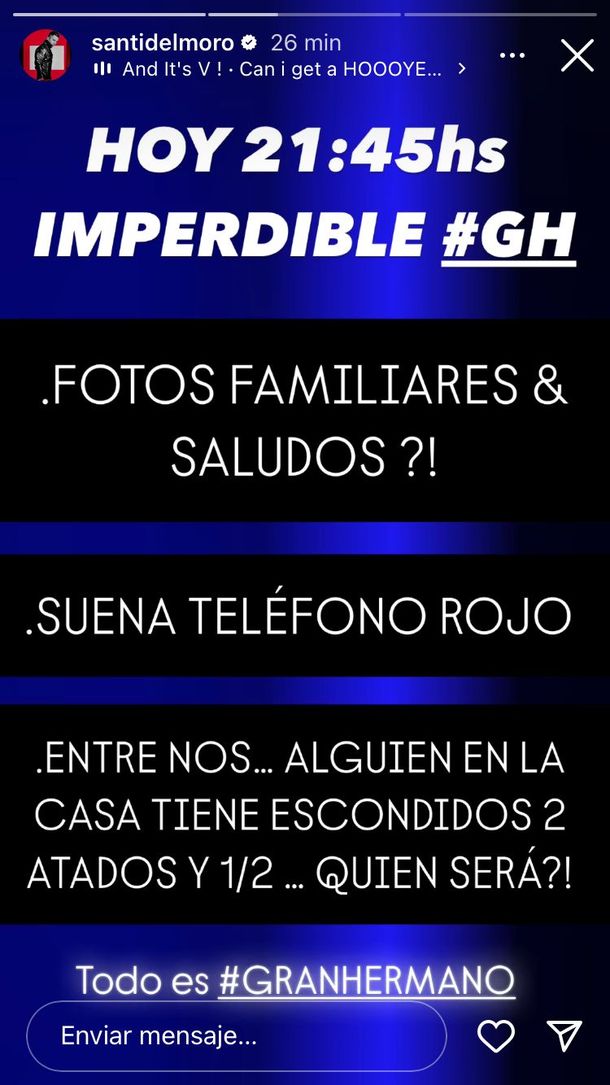 Además, Del Moro anunció que hoy le podrían mostrar a los jugadores "fotos de sus familiares y saludos", que "suena el teléfono rojo" nuevamente y que habrá polémica porque "alguien en la casa tiene escondidos dos atados y medio de cigarrillos".