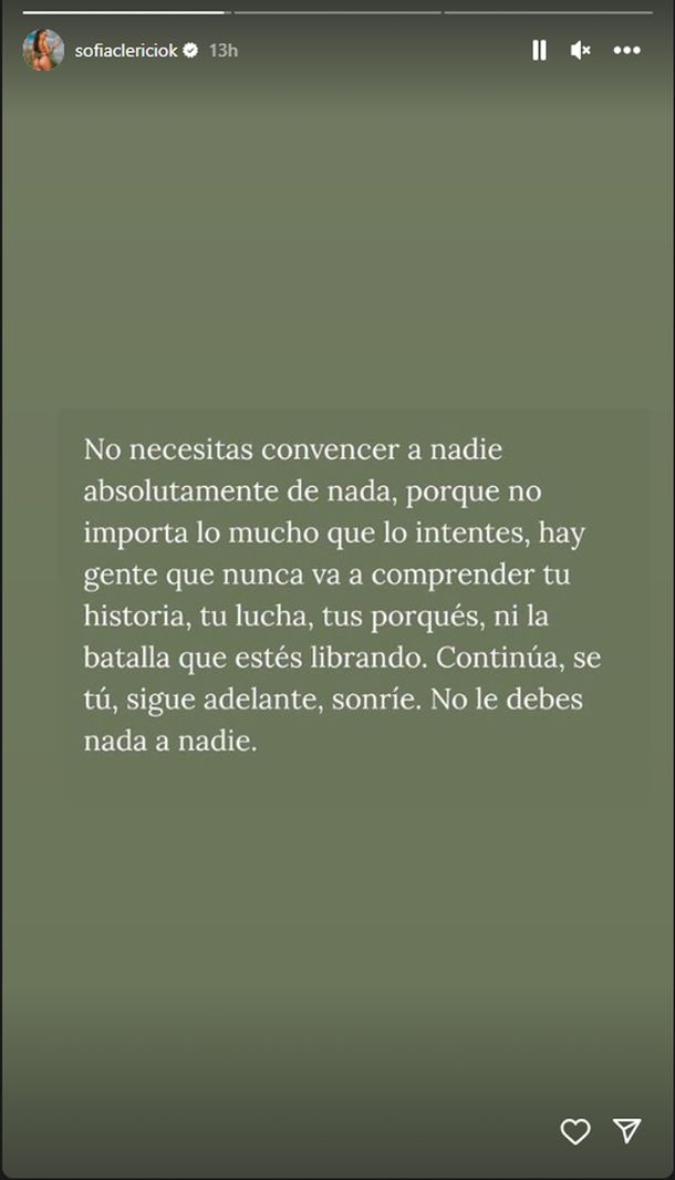 Luego de reactivarla, en Twitter e Instagram, publicó un nuevo mensaje: “No necesitas convencer a nadie absolutamente de nada porque no importa lo mucho que lo intentes, hay gente que nunca va a comprender tu historia, tu lucha, tus porqués, ni la batalla que estés librando. Continúa, se tú, sigue adelante, sonríe. No le debes nada a nadie”.