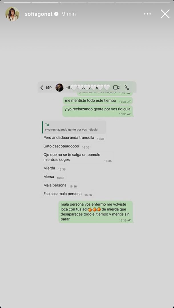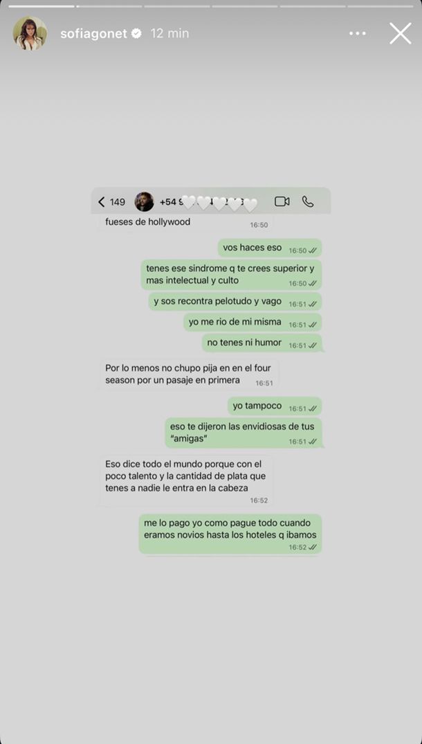 Las historias continúan con reproches vinculados al dinero y la relación: “Me lo pago yo como pagué todo cuando éramos novios, hasta los hoteles que íbamos”, escribe ella, mientras él insiste: “Eso dice todo el mundo porque con el poco talento y la cantidad de plata que tenés a nadie le entra en la cabeza”.