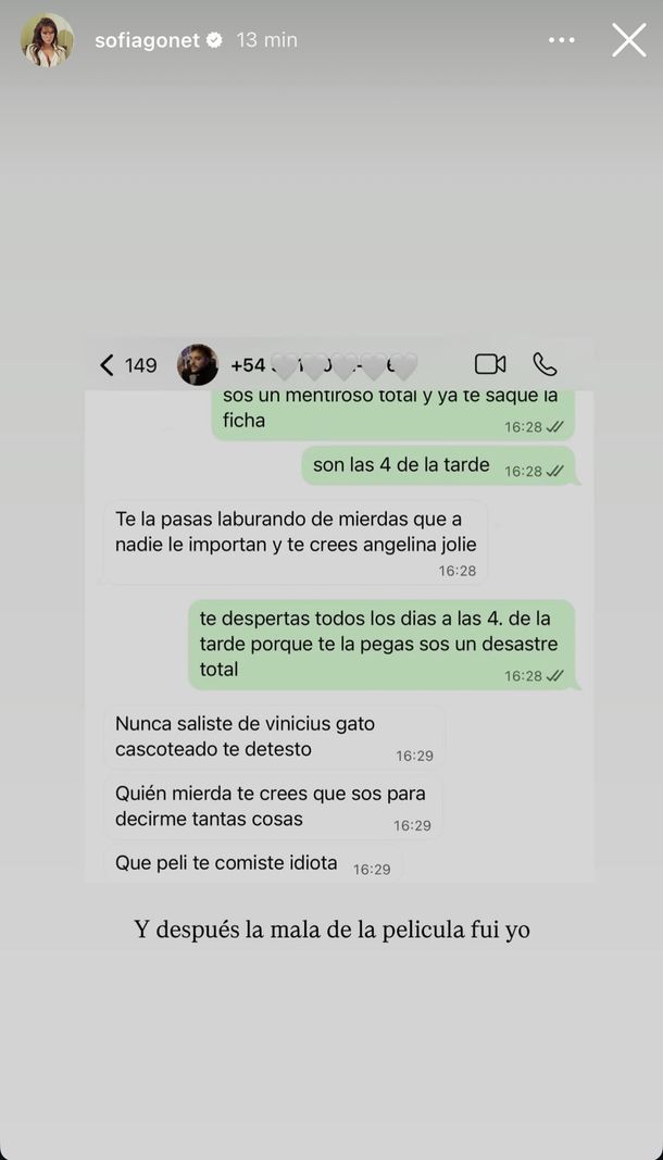 Sofía “La Reini” Gonet decidió romper el silencio y lo hizo de la forma más explosiva: compartiendo en sus historias de Instagram una serie de capturas de chats que atribuyó a Homero Pettinato, donde se leen mensajes cargados de insultos, agresiones y descalificaciones personales.