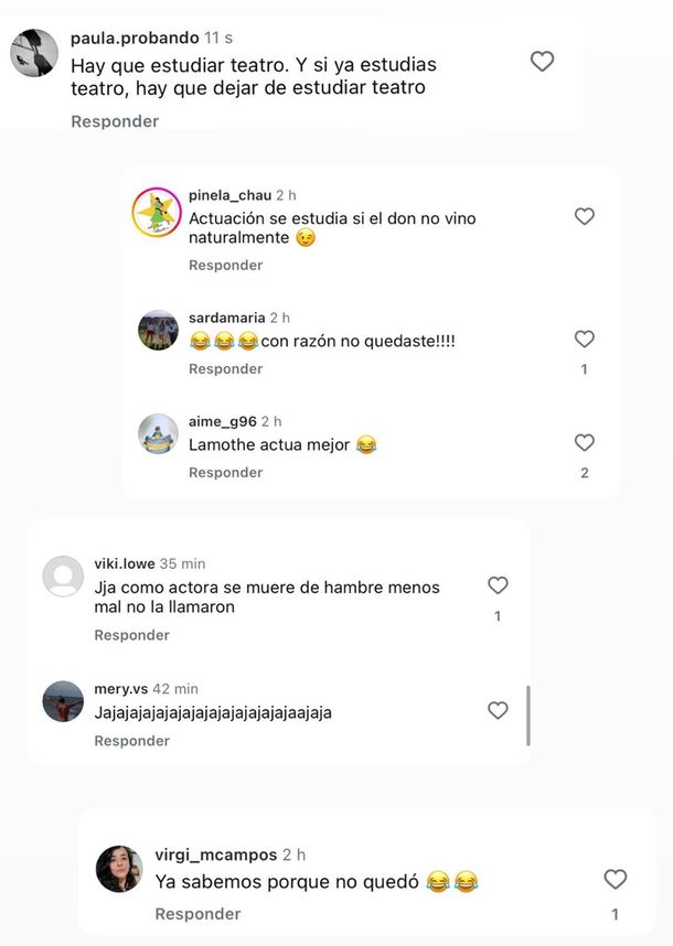 La modelo decidió hace público su casting para la serie "En el Barro", y tuvo comentarios de vario tipo, pero como lo es en estos casos predominaron los negativos: "Hay que estudiar teatro, y si ya estudias teatro, hay que dejar de estudiar teatro", "actuación se estudia si el don no vino naturalmente", "como actora se muere de hambre menos mal no la llamaron" son solo alguno de los comentarios, ah, también cayó Esteban Lamothe en la volteada haciendo hincapié en que él actúa mejor.