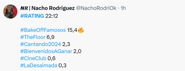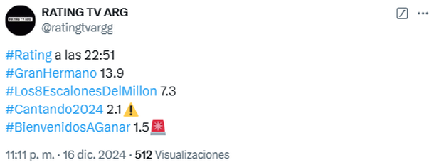 Pero Cerca de las 23, Gran Hermano era lo más visto: el debate con Renato en vivo medía 13.9 puntos de rating, con picos arroba de los 14, imponiéndose por sobre "Los 8 escalones del millón" (El Trece), que registra 7.3 puntos, y el Cantando 2024 (América TV) que apenas supera los 2 puntos.