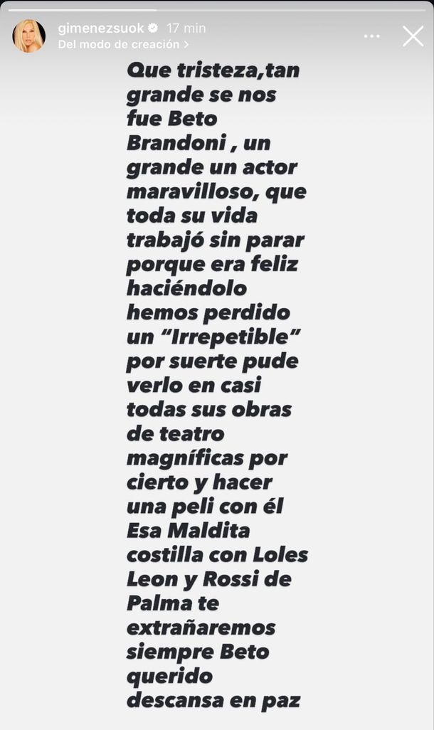 Conmovida por la noticia, la conductora compartió un mensaje en el que expresó su tristeza y destacó la pasión que el actor tuvo por su trabajo: "Qué tristeza tan grande. Se nos fue Beto Brandoni, un grande, un actor maravilloso, que toda su vida trabajó sin parar porque era feliz haciéndolo".