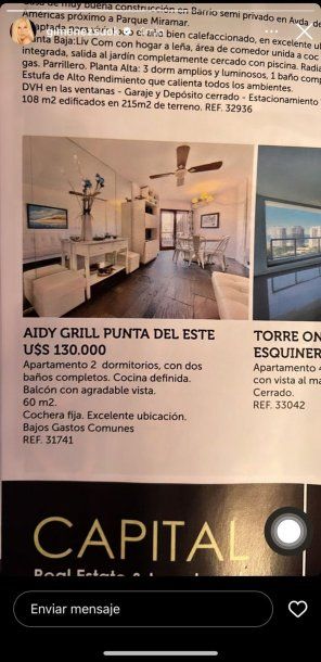 En las últimas horas, la conductora colgó en sus historia una llamativa foto, en la cual se puede ver una propiedad a la venta en Punta del Este, a un valor de 130 mil dólares.
