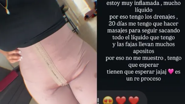 En sus historias, la mamá de Jamaica explicó en qué consiste el tratamiento y el proceso de recuperación: “Estoy muy inflamada, mucho líquido. Por eso tengo los drenajes, 20 días me tengo que hacer masajes para seguir sacando todo el líquido que tengo y las fajas llevan muchos apósito. Por eso no muestro. Tengo que esperar. Tienen que esperar. Es un reproceso”.