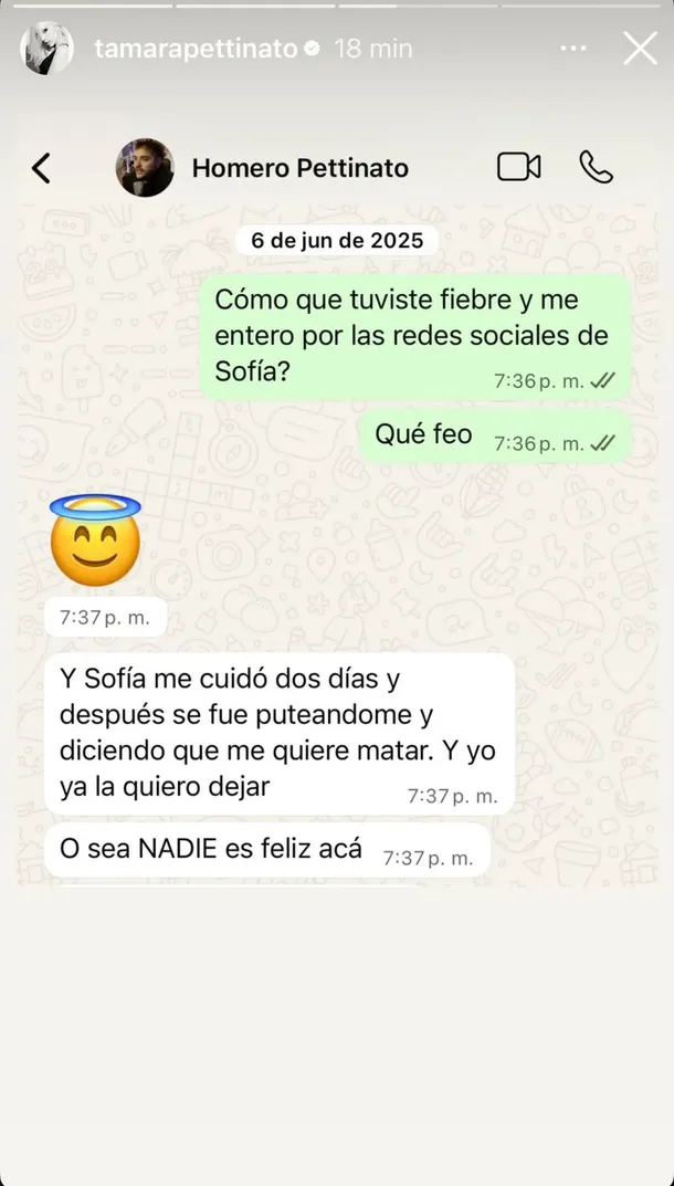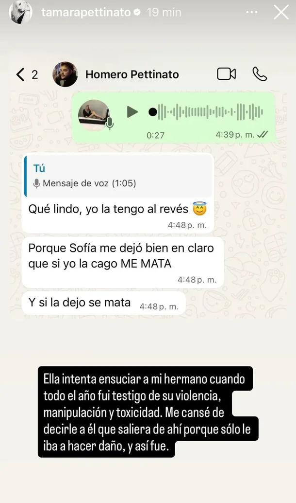 En ese contexto, durante la jornada del domingo, Tamara recurrió a sus redes sociales para publicar capturas de conversaciones mantenidas con Homero, con la intención de respaldar su versión de los hechos. En uno de esos diálogos, ella le había enviado un audio y él respondió: "Sofía me dejó bien en claro que si yo la cago me mata, y si la dejo, se mata".