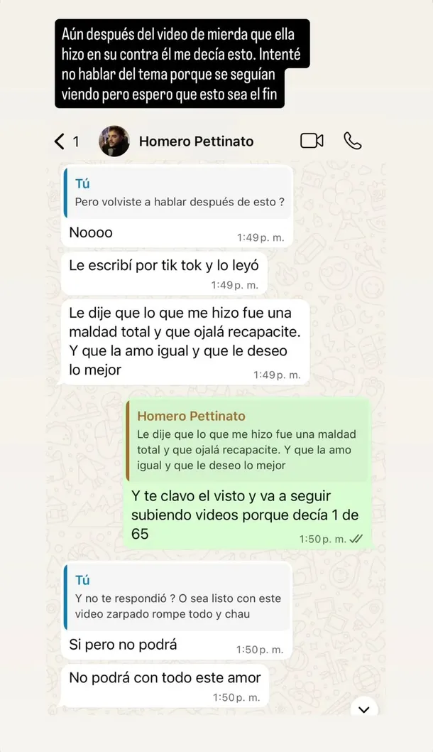 Finalmente, a través de una nueva historia en Instagram en la que mostró otro chat, la hermana del humorista reiteró su postura y agregó: "Aún después del video que ella hizo en su contra, él me decía esto. Intenté no hablar del tema porque se seguían viendo, pero espero que esto sea el fin".