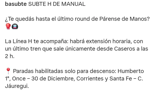 A través de sus redes sociales, la cuenta oficial del Subte reforzó la información con un mensaje directo para los fanáticos. “¿Te quedás hasta el último round de Párense de Manos? La Línea H te acompaña”, indicaron.