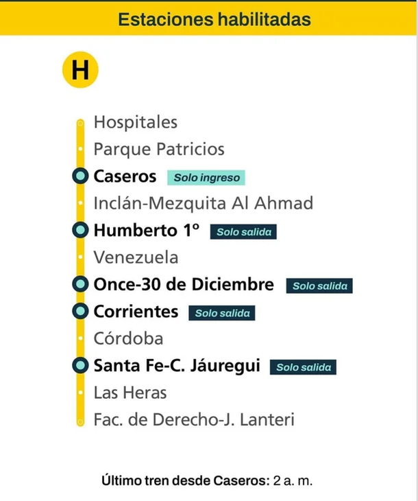 - Sin combinaciones: Al tratarse de una medida exclusiva para la Línea H, el resto de la red mantendrá su horario de cierre habitual, por lo que no se podrán realizar trasbordos con otras líneas de subte.