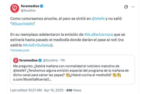 En su cuenta de X publicaron: "Me pregunto: ¿Saldrá mañana con normalidad el noticiero matutino de @telefe? ¿Tendremos alguna emisión especial del programa de la mañana de dicho canal para salvar las papas? ¿Habrá cocina al mediodía?". Luego de esto, agregó: "NO sale al aire #BuenTelefe y en su lugar se adelantó la emisión de #ALaBarbarossa con Nancy Pazos en la conducción".