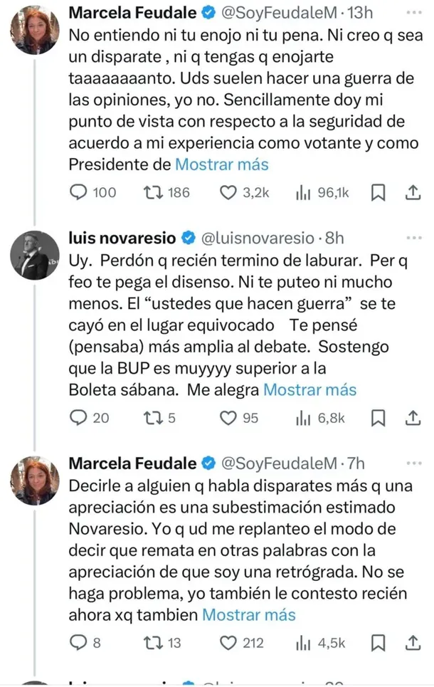Feudale, en su última réplica, defendió su postura y criticó la apreciación del periodista: "Decirle a alguien que habla disparates más que una apreciación es una subestimación, estimado Novaresio. Yo que Ud. me replanteo el modo de decir que remata en otras palabras con la apreciación de que soy una retrógrada. No se haga problema, yo también le contesto recién ahora porque también recién término de laburar. No lo reconocí por tu posteo. No hablé de la boleta, hablé de la seguridad de la boleta. Parece que falla la comprensión. Saludos".