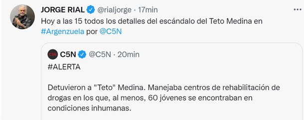 "Hoy a las 15 todos los detalles del escándalo del Teto Medina en Argenzuela por C5N", adelantó Jorge Rial desde su cuenta de Twitter.