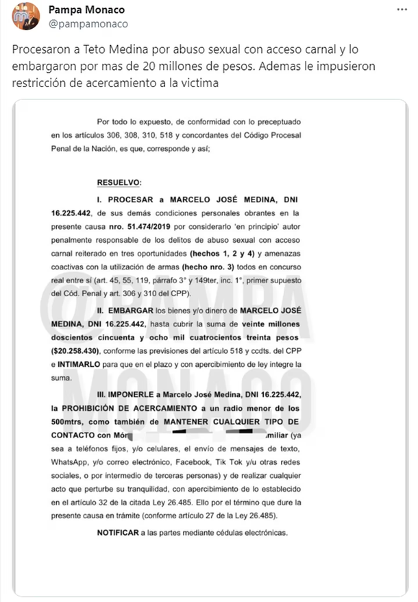 La noticia fue revelada por el periodista Pampa Mónaco, quien compartió la resolución judicial que incluye un embargo de más de 20 millones de pesos y una restricción de acercamiento a la víctima.