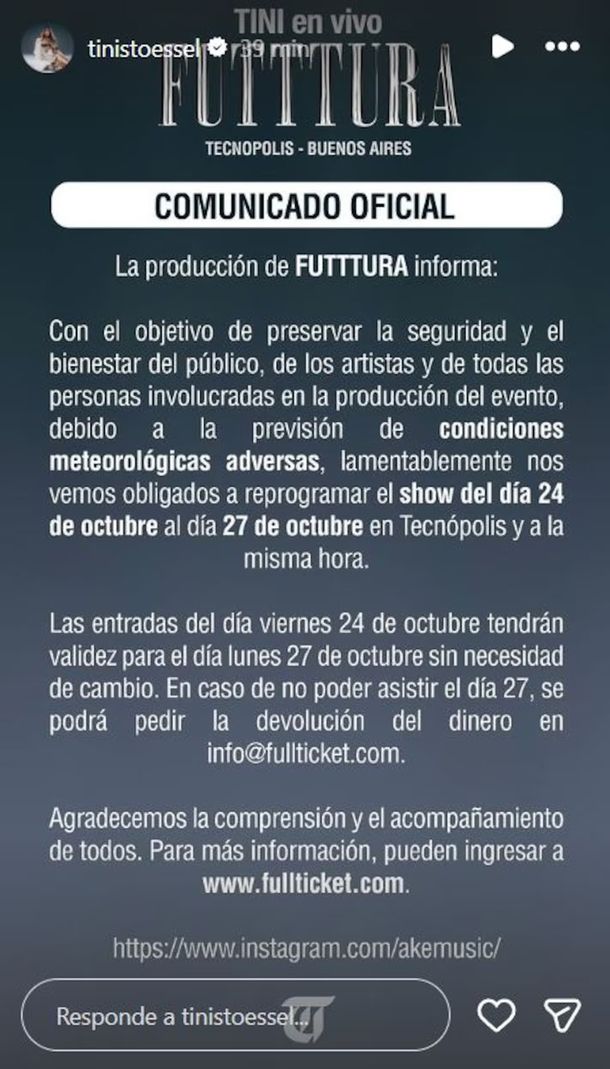 A pocas horas de lo que iba a ser su debut en Tecnópolis, Tini Stoessel se mostró visiblemente angustiada tras confirmar que su primer recital de Futttura, su nueva etapa musical, deberá posponerse debido a las condiciones meteorológicas adversas.