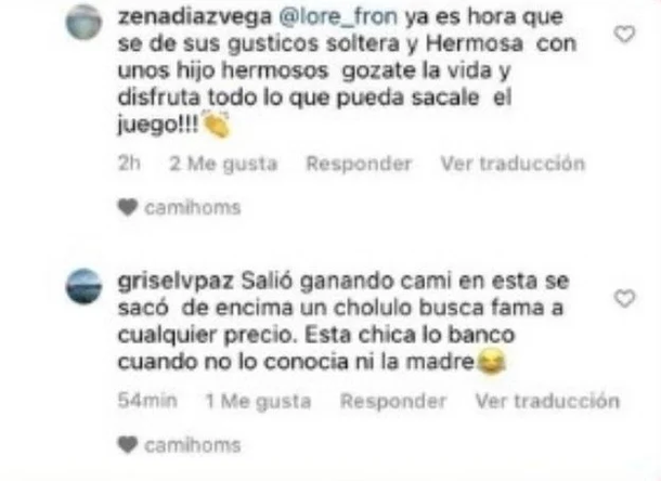 "Salió ganando Cami en esta. Se sacó de encima un cholulo busca fama, a cualquier precio. Esta chica lo bancó cuando no lo conocía ni la madre", decía el comentario al que Camila Homs le dio su me gusta.