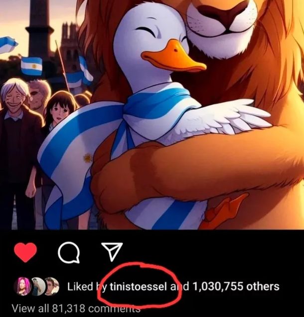 Aunque luego lo borró, la artista había "likeado" el meme que Javier Milei compartió donde aparecía la caricatura de un león abrazando a un pato.