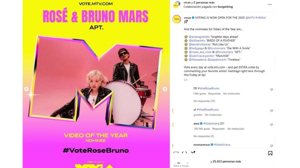 Para Video del Año, Artista del Año y Mejor Artista Nuevo, se pueden votar extra ingresando al Instagram oficial @vmas y comentando las etiquetas de tus nominados favoritos en las publicaciones fijadas. Esta opción estará disponible y será válido hasta este viernes a las 18:00 (ET).