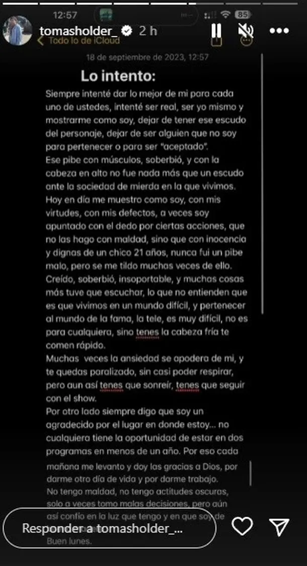 “Nunca fui un pibe malo, pero se me tildó muchas veces de ello. Creído, soberbio, insoportable, y muchas cosas más tuve que escuchar. Lo que no entienden que es que vivimos en un mundo difícil, y pertenecer al mundo de la fama, la tele, es muy difícil, no es para cualquiera, sino tenés la cabeza fría te comen rápido”, continuó el influencer.