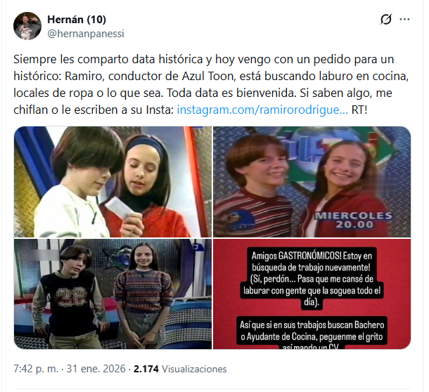 La iniciativa fue difundida por el periodista Hernán Panessi en la red social X (ex Twitter), quien compartió el pedido del actor: "Siempre les comparto data histórica y hoy vengo con un pedido para un histórico: Ramiro está buscando laburo en cocina, locales de ropa o lo que sea".