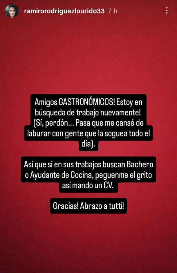 A través de sus historias de Instagram, Rodríguez fue directo y sincero sobre su situación y el rubro al que apunta, alejado de las cámaras. "Amigos GASTRONÓMICOS! Estoy en búsqueda de trabajo nuevamente! (Sí, perdón... Pasa que me cansé de laburar con gente que la soguea todo el día)", escribió el ex conductor, haciendo referencia a las malas condiciones laborales que enfrentó recientemente.