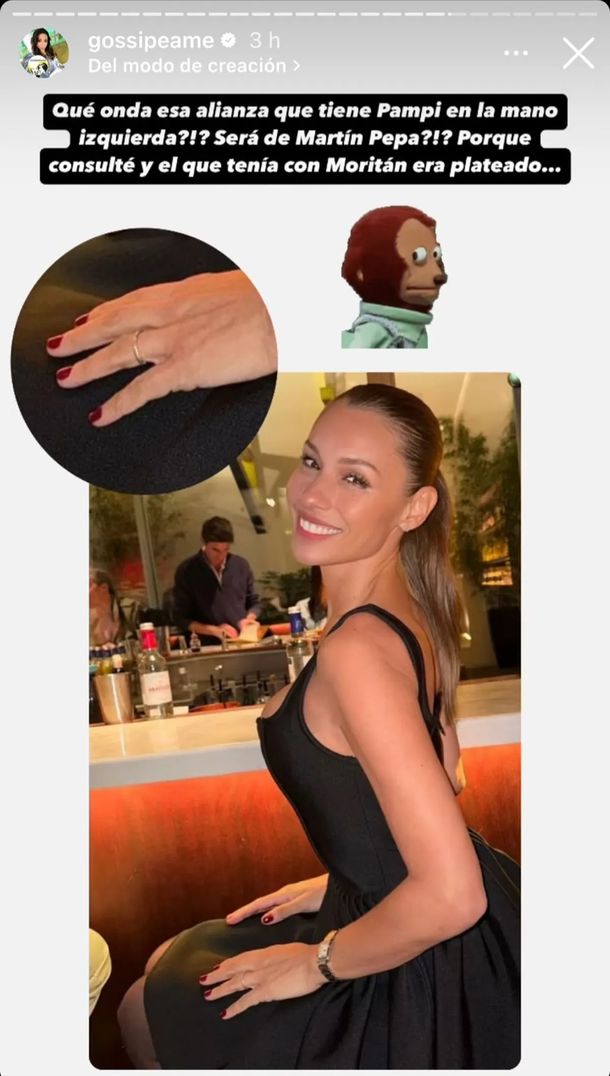En este sentido, llamó la atención el anillo dorado que tenía en el dedo anular de su mano izquierda:"¿Qué onda esa alianza que tiene Pampi en la mano izquierda? ¿Será de Martín Pepa?", sugirió Pochi en las historias de @gossipeame, compartiendo la foto de la modelo.