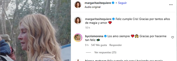 Las muestras de cariño también llegaron desde Margarita, el proyecto más reciente de la productora, que compartió un video donde se la ve recibiendo flores y cálidas palabras de su equipo. En los comentarios, Cris respondió con un mensaje lleno de amor: “Los amo siempre. Gracias por hacerme tan feliz”.