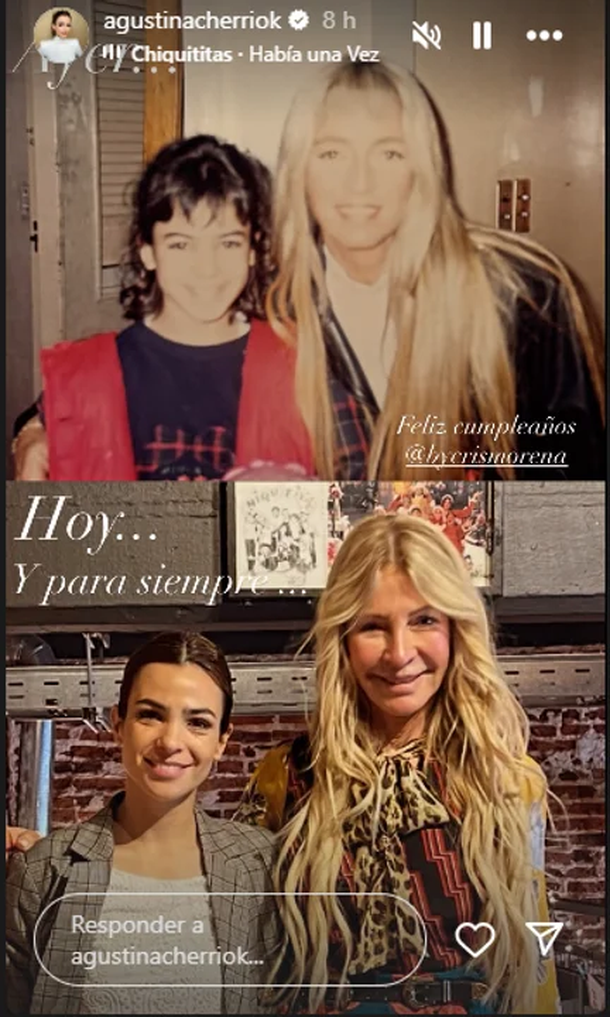 Por su parte, Agustina Cherri publicó un collage de fotos junto a Cris —una de su infancia y otra actual— tomadas de la mano, con una emotiva frase: “Ayer... Hoy... Y para siempre”, reafirmando el lazo afectivo que las une más allá del tiempo y las circunstancias.