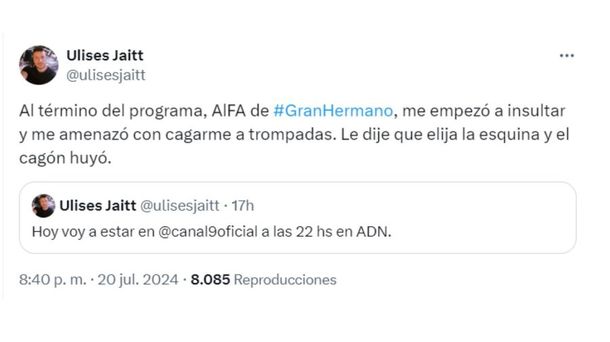 Y, si bien todo parecía haberse calmado entre el periodista y el influencer, la discusión siguió luego del aire. Así fue cómo lo contó Ulises Jaitt en su cuenta de X. Por lo que explicó, Alfa lo amenazó al terminar el programa: "Al término del programa, Alfa de Gran Hermano, me empezó a insultar y me amenazó con cagarme a trompadas. Le dije que elija la esquina y el cagón huyó".