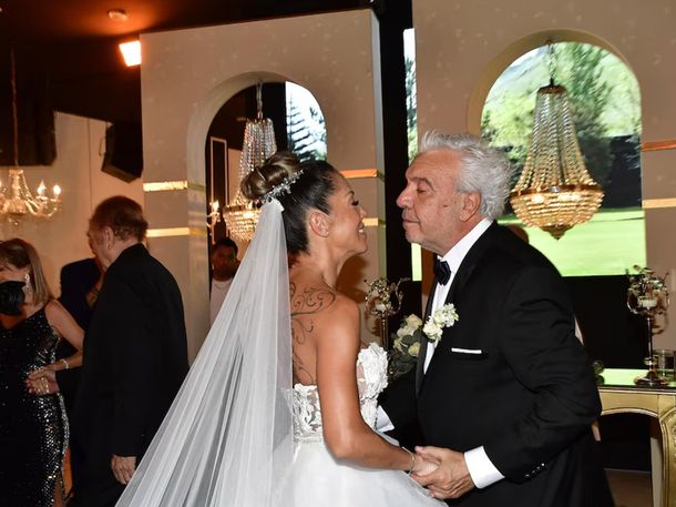 Entre los padrinos se destacó Lizy Tagliani, quien envió un mensaje emotivo en video al no poder estar presente al inicio. El ambiente estaba cargado de afecto, y cada detalle reforzaba la importancia del momento para los novios. Chimi ingresó al salón en un auto deportivo, luciendo un vestido blanco de tul con un escote recto, un velo largo y un peinado recogido que dejaba ver el tatuaje que cruza su espalda. Coco, fiel a su estilo, eligió un smoking negro con clavel blanco en el ojal.