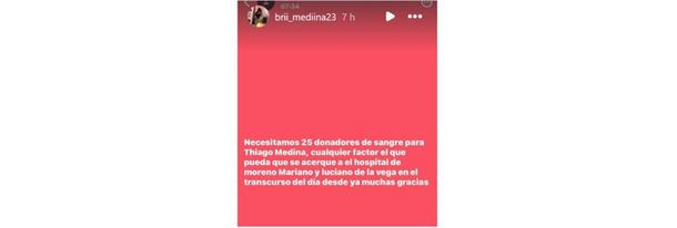 En paralelo, su hermana melliza Brisa Medina utilizó las redes para solicitar colaboración: "Necesitamos 25 donadores de sangre, cualquier factor. El que pueda que se acerque al Hospital de Moreno, Mariano y Luciano de la Vega, en el transcurso del día".