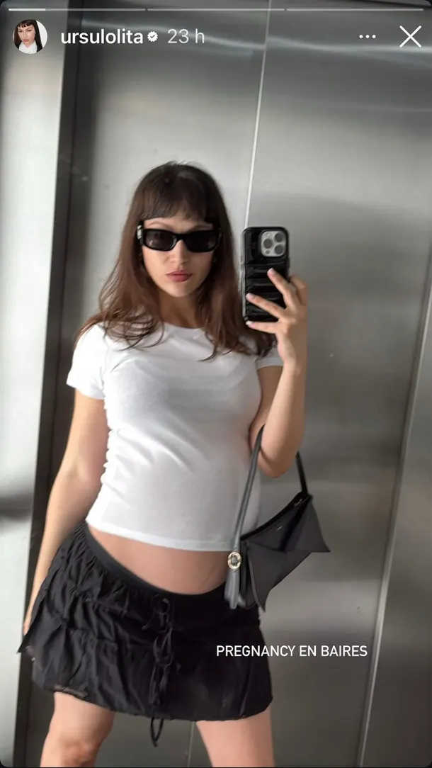 En una de esas postales se observa a Úrsula frente al espejo de un ascensor, retratándose con su look característico: minifalda negra, remera blanca básica y la pancita al aire y la frase: "Pregnancy en Baires (Embarazo en Buenos Aires)".