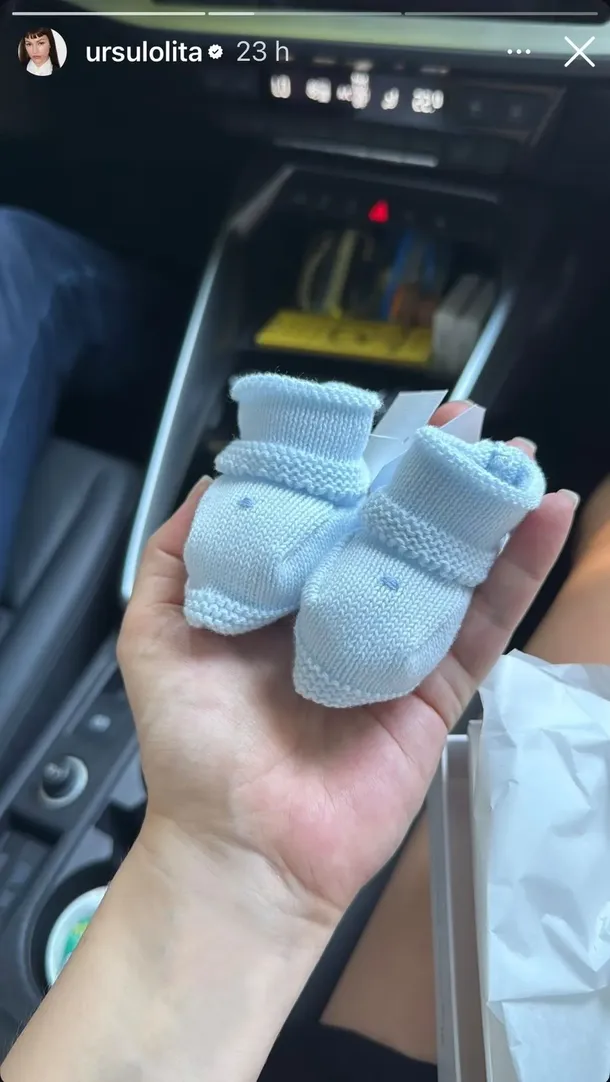 Luego, sumó otra imagen que encendió aún más la curiosidad. En ese registro aparece el primer plano de su mano dentro del auto, en el asiento del acompañante, sosteniendo un par de escarpines diminutos.