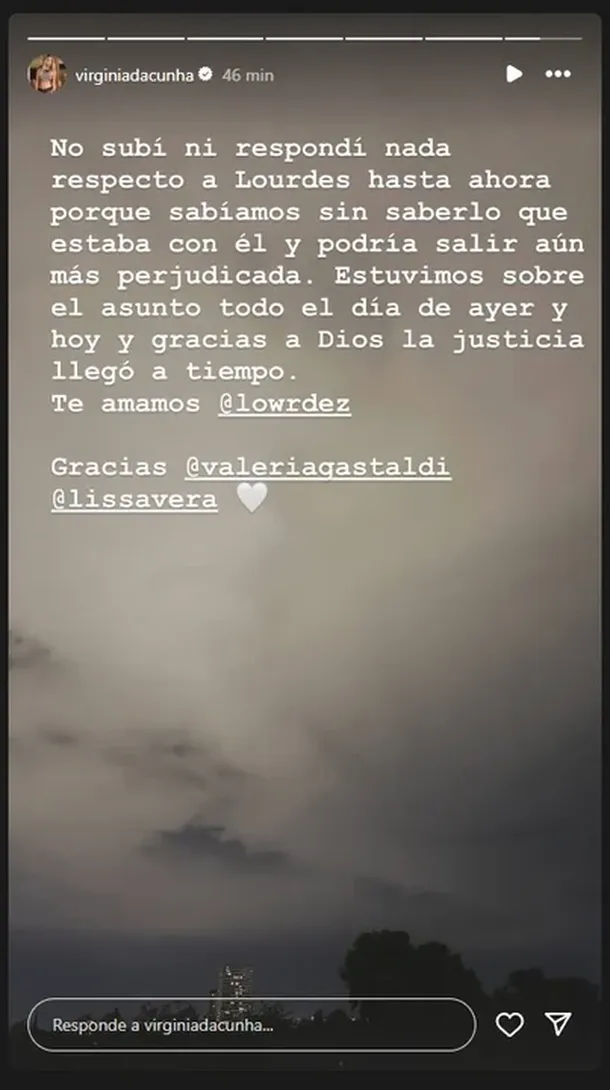 A través de su cuenta de Instagram, habló por primera vez del caso donde explicó las razones por las cuales el entorno de la banda optó por mantener silencio público hasta que la intervención judicial estuviera en curso. “No subí ni respondí nada respecto a Lourdes hasta ahora porque sabíamos sin saberlo que estaba con él y podría salir aun más perjudicada. Estuvimos sobre el asunto todo el día de ayer y hoy. Gracias a Dios, la Justicia llegó a tiempo. Te amamos”, señaló la integrante de la agrupación en su mensaje difundido en la red social.