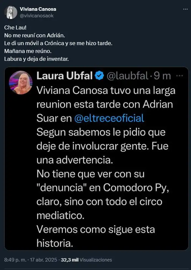 Todo comenzó cuando Ubfal escribió en su cuenta de X que Canosa había mantenido una extensa reunión con Suar y que, según sus fuentes, el encuentro había servido para advertirle sobre sus declaraciones públicas. "Viviana Canosa tuvo una larga reunión esta tarde con Adrián Suar en eltrece. Le pidió que deje de involucrar gente. No tiene que ver con su denuncia en Comodoro Py, sino con todo el circo mediático", publicó la periodista.
