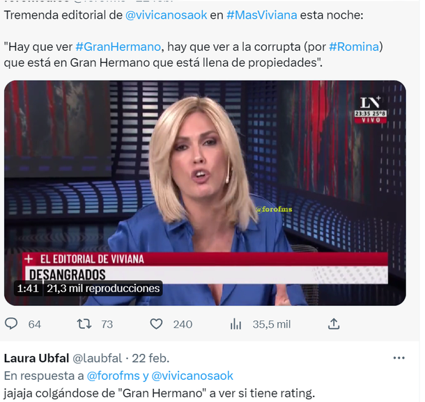 "jajaja colgándose de Gran Hermano a ver si tiene rating", escribió Laura Ubfal desde su cuenta de Twitter contestándole a Canosa.