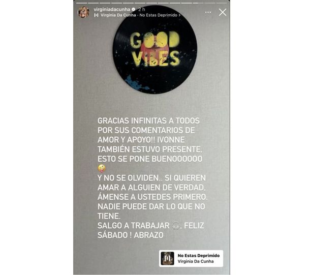 Finalmente, Virginia cerró su mensaje con reflexivas palabras: "Y no se olviden... si quieren amar a alguien de verdad, ámense a ustedes primero. Nadie puede dar lo que no tiene".
