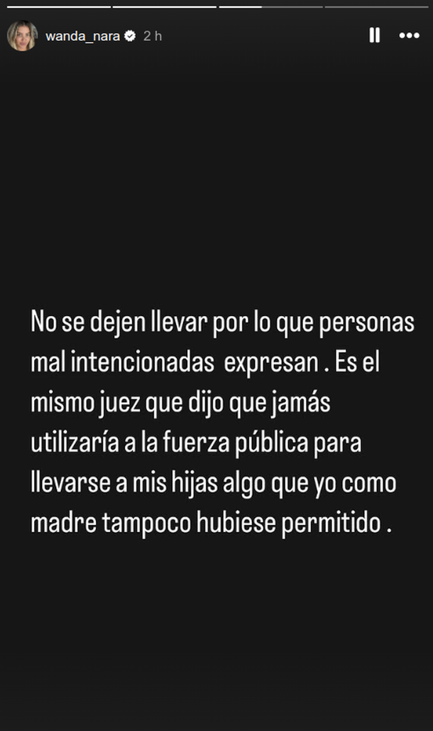 "Voy siempre a trabajar en fortalecer el vínculo, como lo comuniqué en la Justicia", resumió Nara antes de aclarar un detalle que trascendió días atrás sobre la posibilidad de que el juez en Buenos Aires ordenara el uso de la fuerza pública para llevar a Francesca e Isabella a la casa de Mauro Icardi.