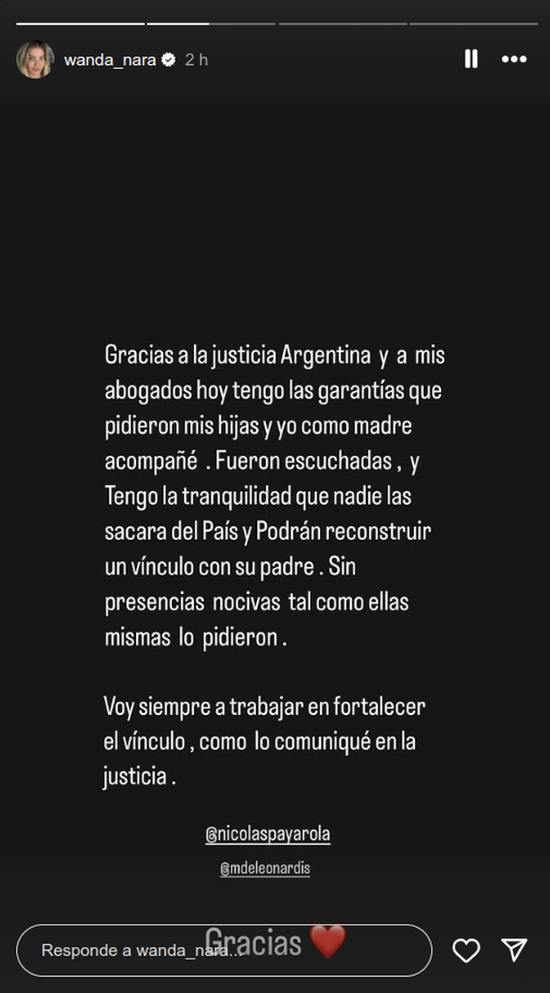 "Gracias a la justicia argentina y a mis abogados hoy tengo las garantías que pidieron mis hijas, y yo como madre acompañé. Fueron escuchadas, y tengo la tranquilidad de que nadie las sacará del país y podrán reconstruir un vínculo con su padre", expresó Wanda Nara a través de su perfil de Instagram, donde todo el verano publicó los capítulos de su drama familiar.