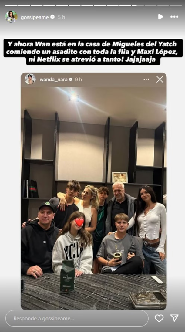 El encuentro, que se llevó a cabo en Nordelta, fue revelado por Pochi de Gossipeame, quien, con ironía, escribió en sus historias de Instagram: “Y ahora está Wan en la casa de Migueles de Yacht comiendo un asadito con toda la familia y Maxi López, ni Netflix se atrevió a tanto jaja”.