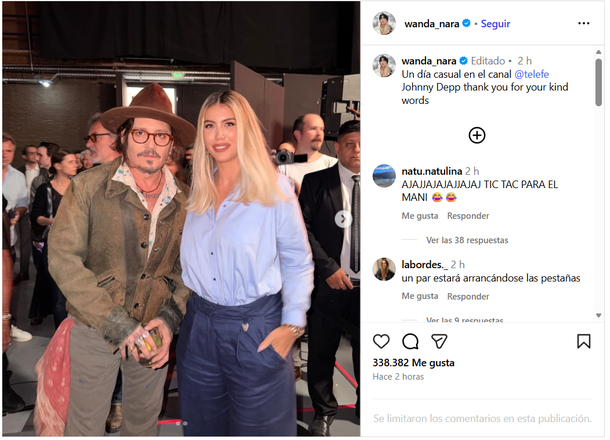 Tras esto, los seguidores de Wanda no dudaron en recordar al futbolista en el posteo: "Tic tac para el maní"; "Un par estará arrancándose las pestañas"; "Realmente siempre consigue todo lo que quiere"; "Lo quiero y lo tengo"; "No te calmes nunca"; fueron sólo algunos de los comentarios celebrando el encuentro entre Nara y Depp.