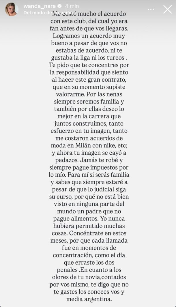 En el mensaje, la empresaria recordó el esfuerzo que hizo para cerrar el acuerdo de Icardi con su actual club, a pesar de que él no estaba convencido del destino. “Me costó mucho el acuerdo con este club, del cual yo era fan antes de que vos llegaras. Logramos un acuerdo muy bueno a pesar de que vos no estabas de acuerdo, ni te gustaba la liga ni los turcos”, escribió.