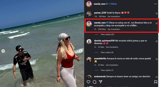 Sin embargo, Wanda insistió en que no hay romance: “Nos llevamos bien. Lo acompañé en su gira y después él me acompañó a mí”, comentó en una de sus publicaciones de Instagram. Su aclaración vino acompañada de imágenes sonrientes con el cantante, en un tono relajado y divertido, que refuerzan la idea de una amistad sólida pero sin compromiso sentimental.