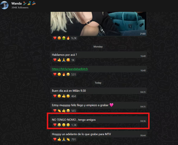 La cercanía entre ambos reavivó rumores de reconciliación, pero Wanda no tardó en responder con contundencia y en primera persona: “No tengo novio, tengo amigos”, escribió en su canal de WhatsApp, intentando apagar el fuego de las versiones que circulaban.