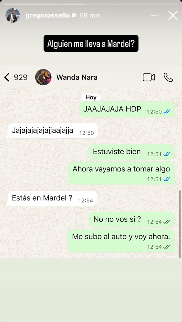 La complicidad entre ambos fue escalando a medida que compartían más fragmentos de su charla privada. Lejos de mostrarse distante, Grego redobló la apuesta y le hizo una propuesta directa a la empresaria. “Ahora vayamos a tomar algo”, disparó el humorista, a lo que Wanda respondió consultándole sobre su ubicación actual: “¿Estás en Mardel?”. Al notar que la conductora se encontraba en la ciudad balnearia, Rossello no dudó en mostrar su predisposición para acortar la distancia: “No, no. ¿Vos sí? Me subo al auto y voy ahora”.