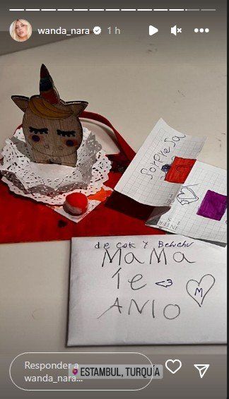 En Instagram Stories, Nara primero posteó la imagen de las cartitas que recibió de sus pequeños. En varios sobres se ven papeles y dibujos que dicen “¡Sorpresa!”, “mamá te amo”.