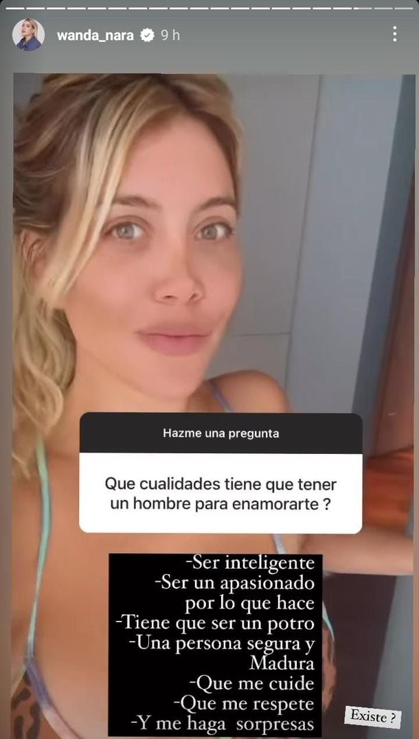 "Ser inteligente, apasionado por lo que hace. Tiene que ser un potro, una persona segura y madura", enumeró Wanda en sus historias, ante las preguntas de sus fans.