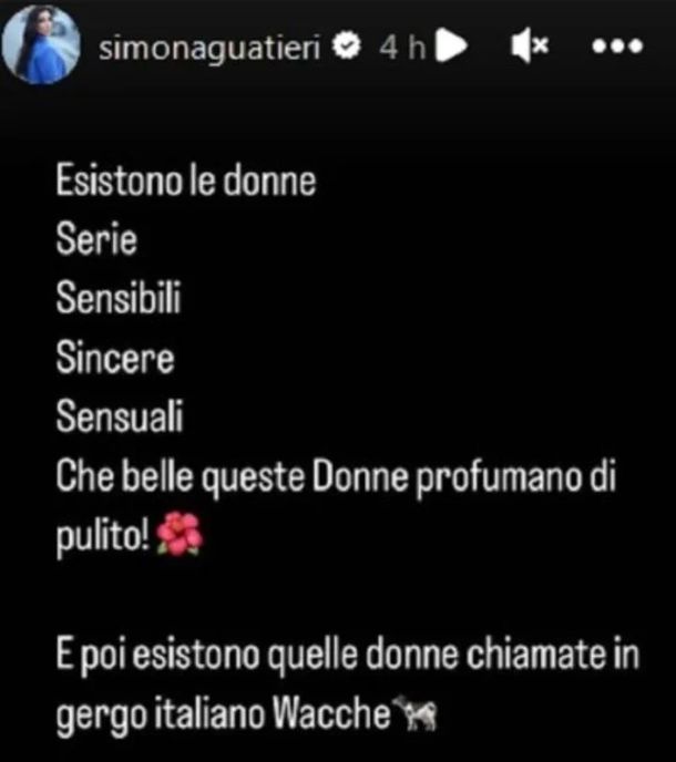 “Hay mujeres serías, sensibles, sinceras, sensuales. ¡Estas hermosas mujeres huelen a limpio! Y luego están esas mujeres llamadas ‘vaca’ en la jerga italiana”, posteó Guatieri. En tanto, la utilización del término Wacche en italiano, aboga a las mujeres que tienen una profesión de dudosa procedencia. En la península este es un insulto del que Nara comprende a la perfección debido a su estrecho lazo con el país europeo.